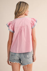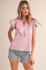 Contrast Blanket Triangle Stitch Ruffled Top Pink