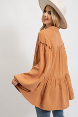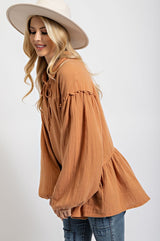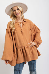 Cotton Gauze Ruffle Bottom Tunic Top Camel