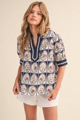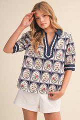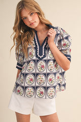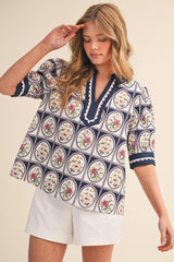 Floral Print Contrast Binding Scallop Trim Top Navy