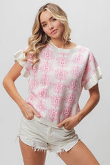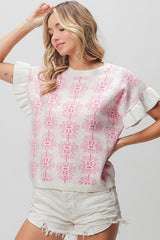Flower Pattern Ruffled Sweater Top Ivory/Fuchsia