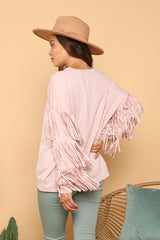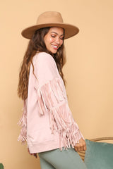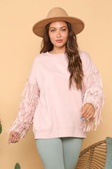 Fringe Sleeve Knit Sweatshirt Dusty Pink