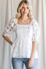Mesh-Checkered Peplum Top White