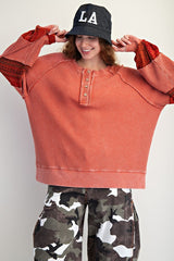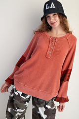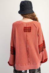 Mixed Fabric Washed Thermal Knit Top Boho Red