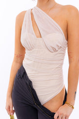 One Shoulder Detail Mesh Bodysuit Cream