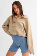 Pocket Detail Fleece Pullover Top Taupe