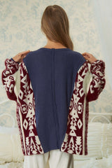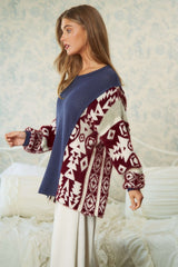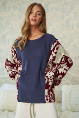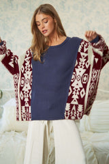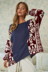 Printed Round Neck Loose Fit Sweater Navy Multi