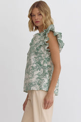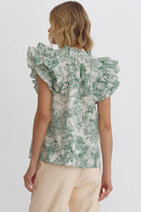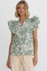 Printed Ruffle Sleeve V-Neck Top Green