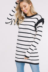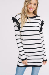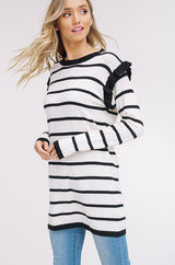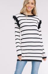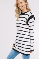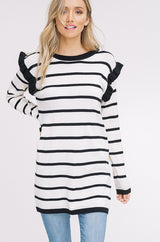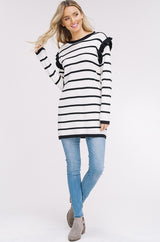 Ruffle Stripe Sweater Top with Ruffle Long Sleeves. Rib-knit at Neck, Cuff & Ruffles. Drop Shoulder