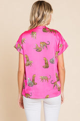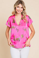 Satin Animal Print V-neck Top Hot Pink