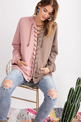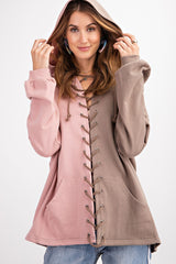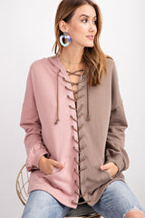 Color Block Laced Up Front Terry Knit Hoodie with Side Pockets