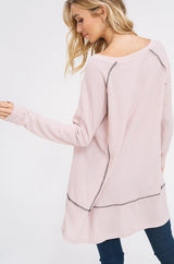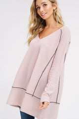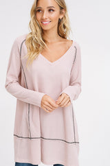 Waffle Textured V-Neck Knit Tunic Top. Contrast color stitches