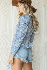 Animal Print Puff Sleeve Wrap Top Denim Blue