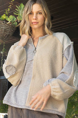 Balloon Sleeve Half Zip Sweater Top Beige Multi