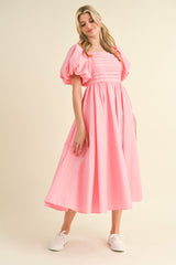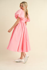 Balloon Sleeve Pleated Midi Dress Pink Bloom