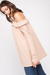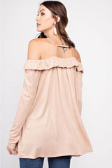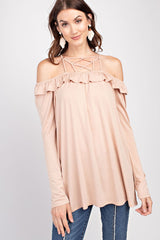Long Sleeve Viscose Rayon Front Ruffle Overlay Cool Laced Up Front & Back Detailing Tunic.