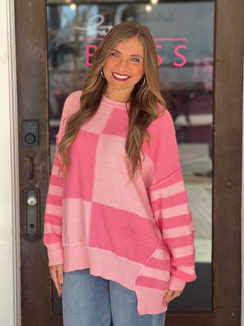 Color Block Stripe Sleeve Sweater Pink/Fuchsia