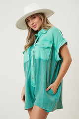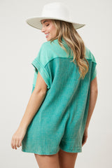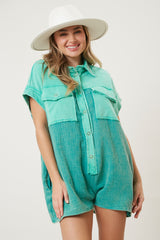 Contrast Terry Button Down Romper Green