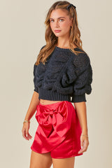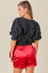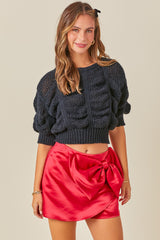 Cropped Shirring Detail Knit Sweater Top Black