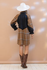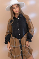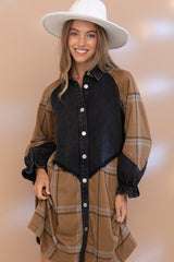 Denim Mix Brushed Plaid Button Up Dress Brown
