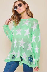 Distressed Star Print Knit featuring Round Neck, Long Sleeve and Loose Fit