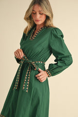 Embroidered Puff Sleeve Midi Dress Hunter Green