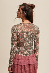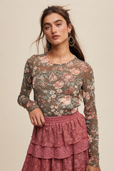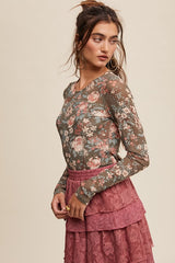 Floral Print Mesh Fitted Top Olive