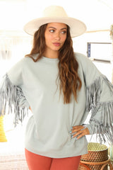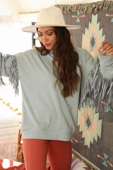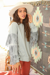 Fringe Sleeve Knit Sweatshirt Dusty Sage