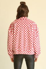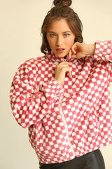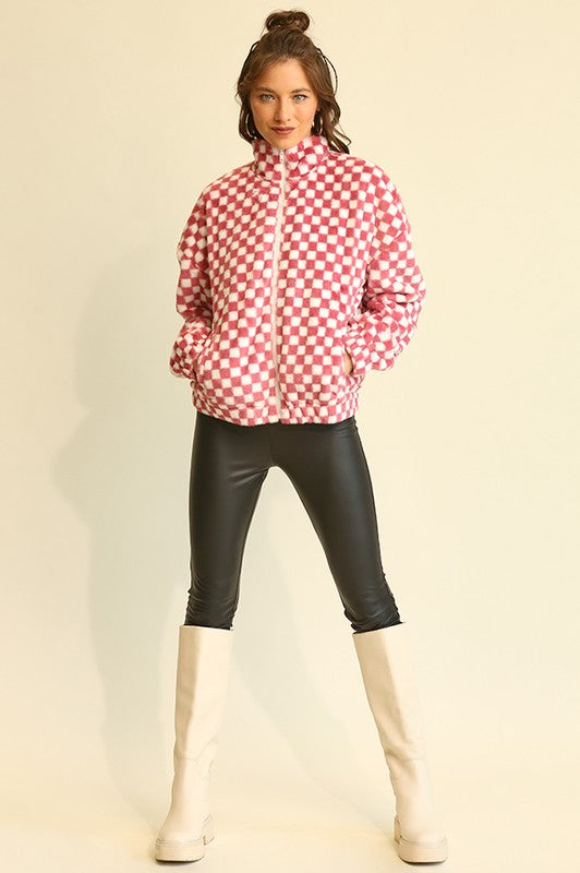 Fuzzy Sherpa Checker Zip Up Jacket Rose