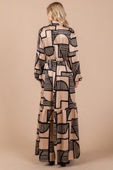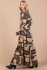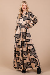 Geometric Satin Print Long Sleeve Maxi Taupe