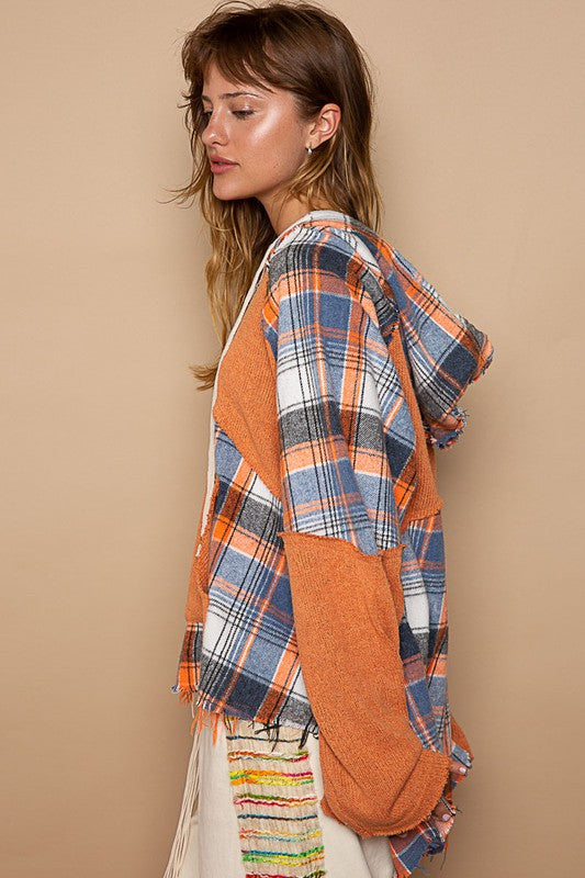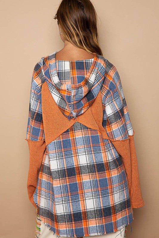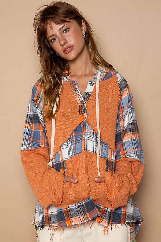 Hooded Kangaroo Pocket Plaid Top Orange