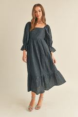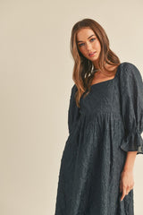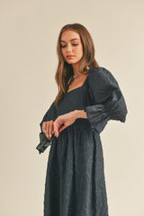 Jacquard Floral Puff Sleeve Midi Dress Navy
