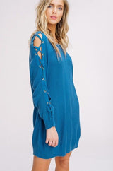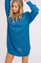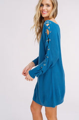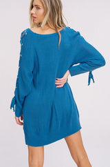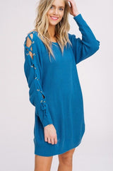 Knit Lace Up Split Sleeve Long Sweater. Knit Crochet Pullover Sweater with Long Sleeves. Ribbed on Neck, Sleeve Open & Bottom Hem. Split Sleeves with Cotton Lace Up & Eyelets