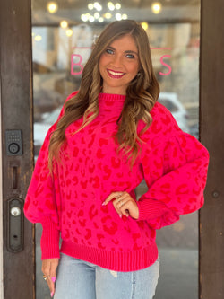 Leopard Print Knit Tuck Puffs Sweater Hot Pink