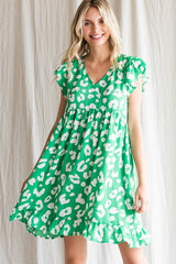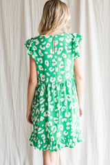 Leopard Print Ruffled Cap Shoulders Dress Green