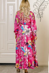 Long Sleeve V-Neck Floral Print Maxi Dress Fuschia