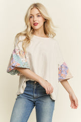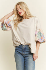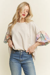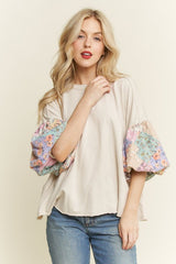 Mineral Washed Floral Patch Puffsleeve Top Natural
