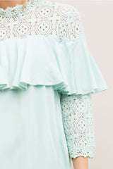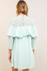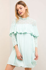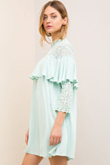 Solid Mock Neck Double Layer Dress featuring Crochet Yoke & Sleeves. Back Keyhole with 4 Button Closure.
