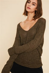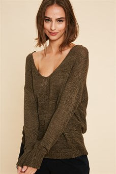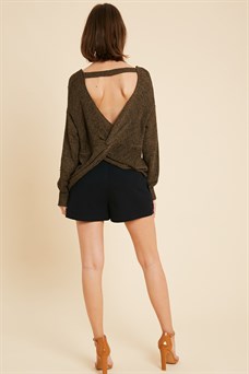 Open Back Knit Pullover Sweater. Long Sleeve, Twisted Back & Boat Neck.