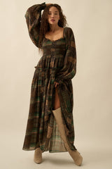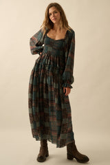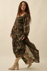 Patchwork Smocked Bubble Sleeve Dress Pine