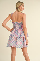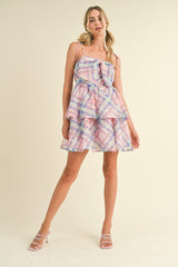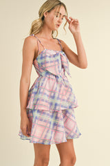 Plaid Bow Tiered Mini Dress Pink Multi Check