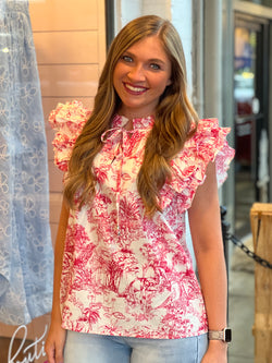Printed Ruffle Sleeve V-Neck Top Magenta