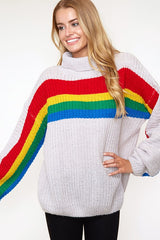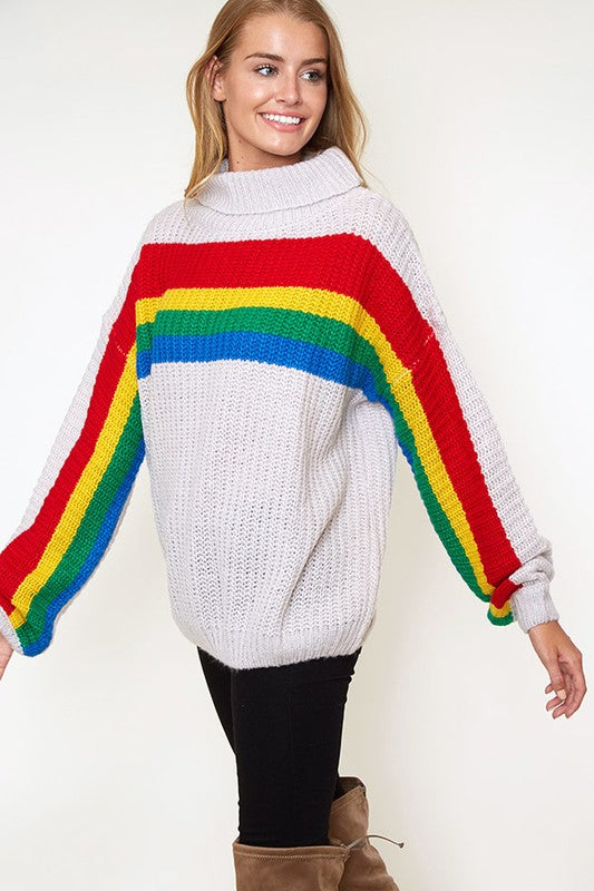 Rainbow stripe chunky sweater featuring turtle neck, long balloon sleeves, and loose-fit silhouette.