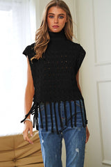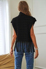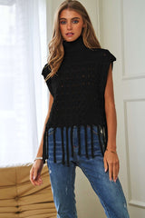 Ribbed Turtleneck Fringe Hem Sweater Vest Black