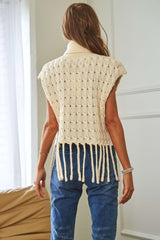 Ribbed Turtleneck Fringe Hem Sweater Vest Cream