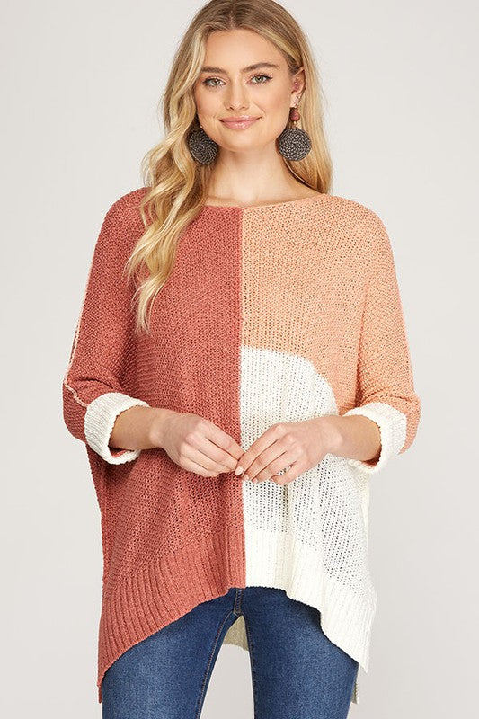Sheer Color Block Knit Pullover Marsala/Peach