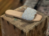 Silver Stud Knitted Woven Strap Slide Nude/Silver