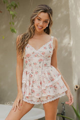 Sleeveless Floral Print Tiered Romper Blush