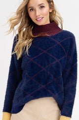 Soft Fur Color Block Ribbed Pullover Sweater. Soft Touch Fur Yarn. Color Block Contrast Ribbed on Neck, Cuff & Hem. Drop Shoulder.