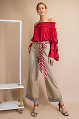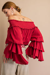Triple Ruffle Sleeve Off Shoulder Top Red