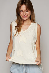 V-Neck Sleeveless Front Star Patches Top Cream